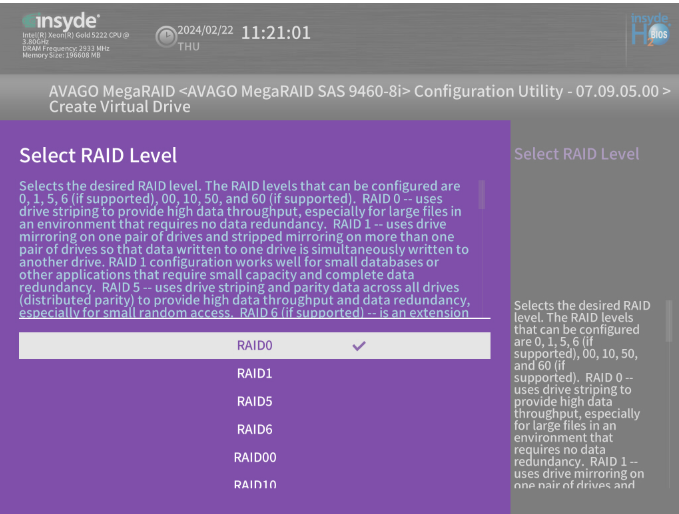Nous allons créer un RAID1 pour l’hyperviseur, nous sélectionnons donc RAID1 dans le menu « Select RAID Level »,