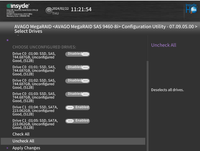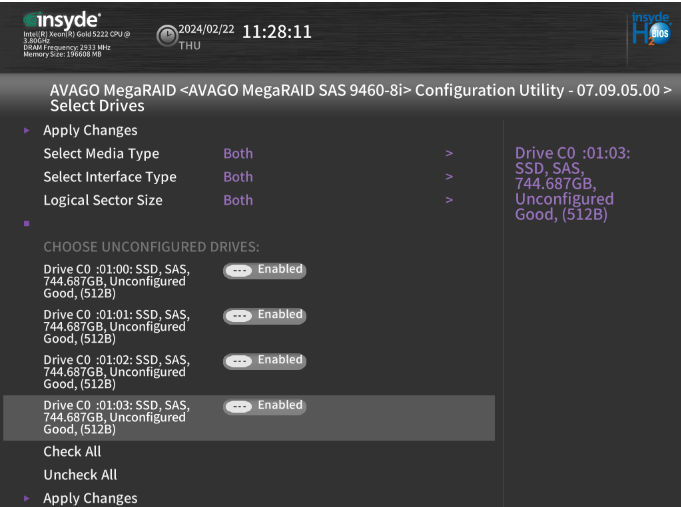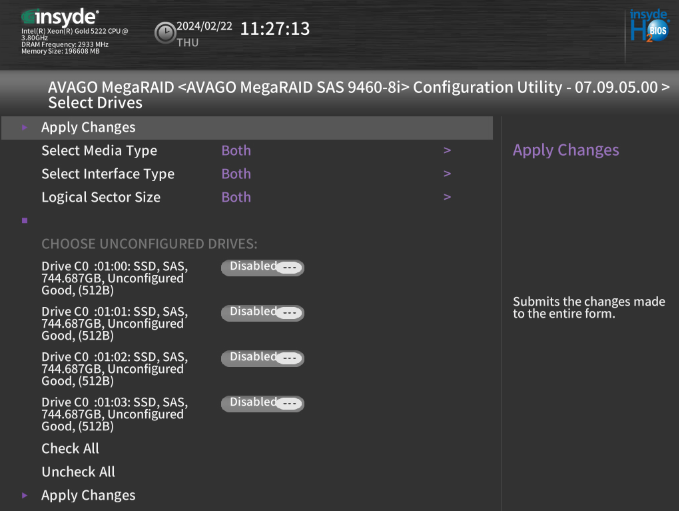 Nous sélectionnons les 4 disques restants. Et Apply Changes, puis « Save Configuration »
