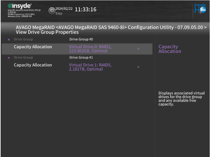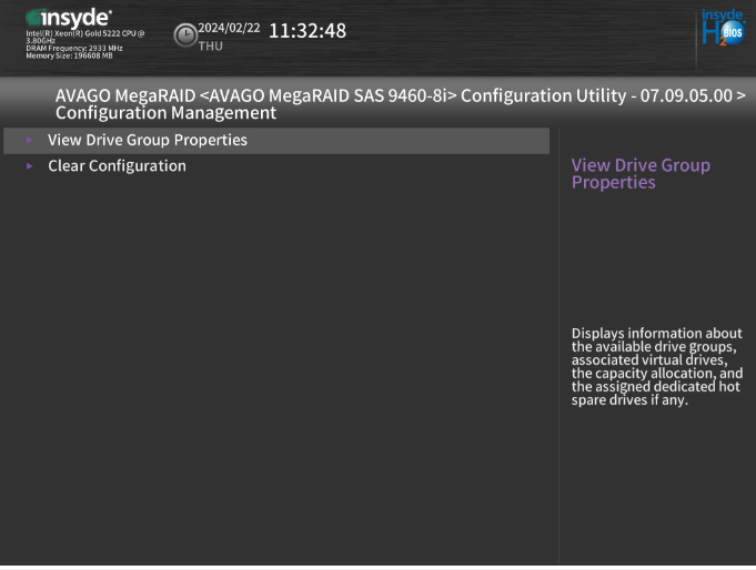 Dans le menu configure, nous avons maintenant la possibilité de regarder les propriétés des groupes de disque dans « View Drive Group Properties »