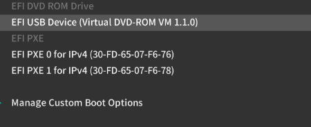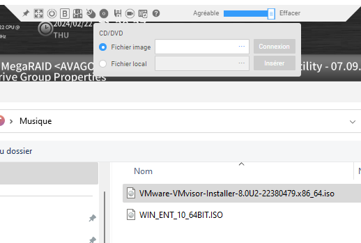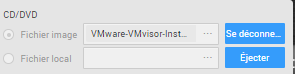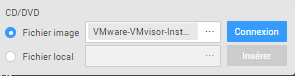 Pour ce faire, il nous faut un ISO contenant l’image de déploiement de l’hyperviseur, que nous allons monter sur un disque CD/DVD virtuel via la console web :