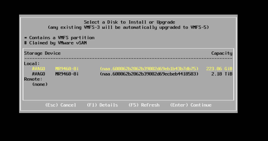 Il faut maintenant sélectionner le disque sur lequel nous allons installer l’hyperviseur, nous sélectionnons le premier disque que nous avons paramétré dans ce but plus tôt.