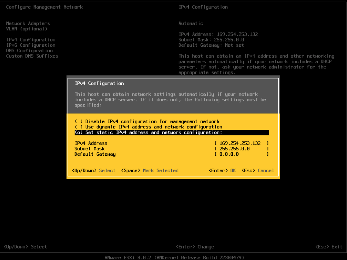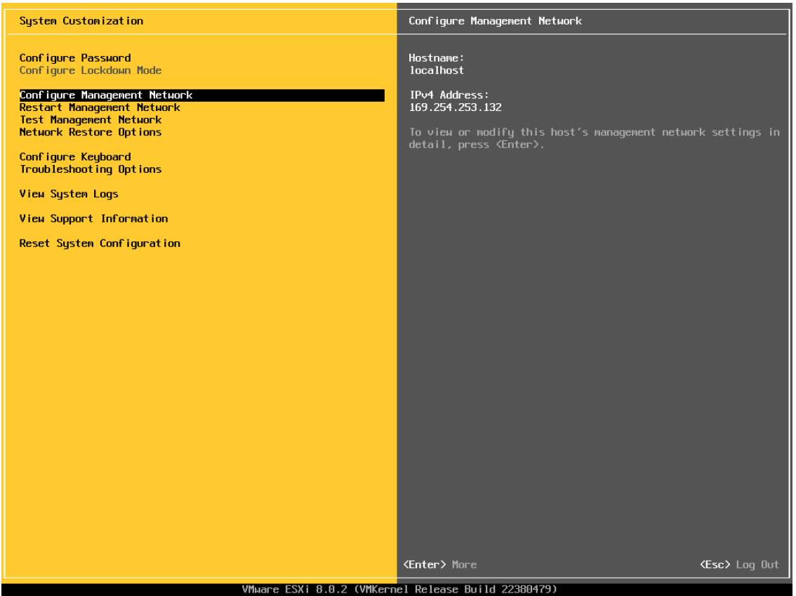 Il n’y a pas de DHCP sur le Vlan de la machine. Il va falloir lui paramétrer une IP fixe pour l’administration, correspondant au réseau sur lequel elle est branchée. Cette ip nous permettra d’accéder à la console web de VMware.