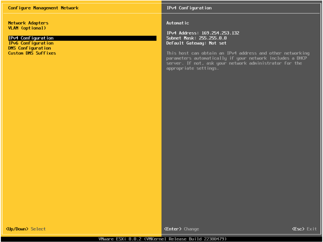 Puis « IPv4 Configuration » (on peut noter que le server s’est paramétrer avec une adresse « APIPA » car il n’as pas pu obtenir d’IP via DHCP)