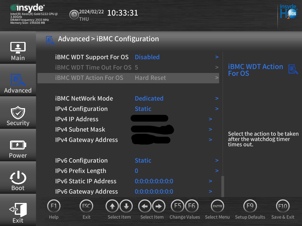 Il faut alors se rendre dans « BIOS Configuration », puis « Advanced », « IPMI iBMC Configuration » et enfin « iBMC Configuration »