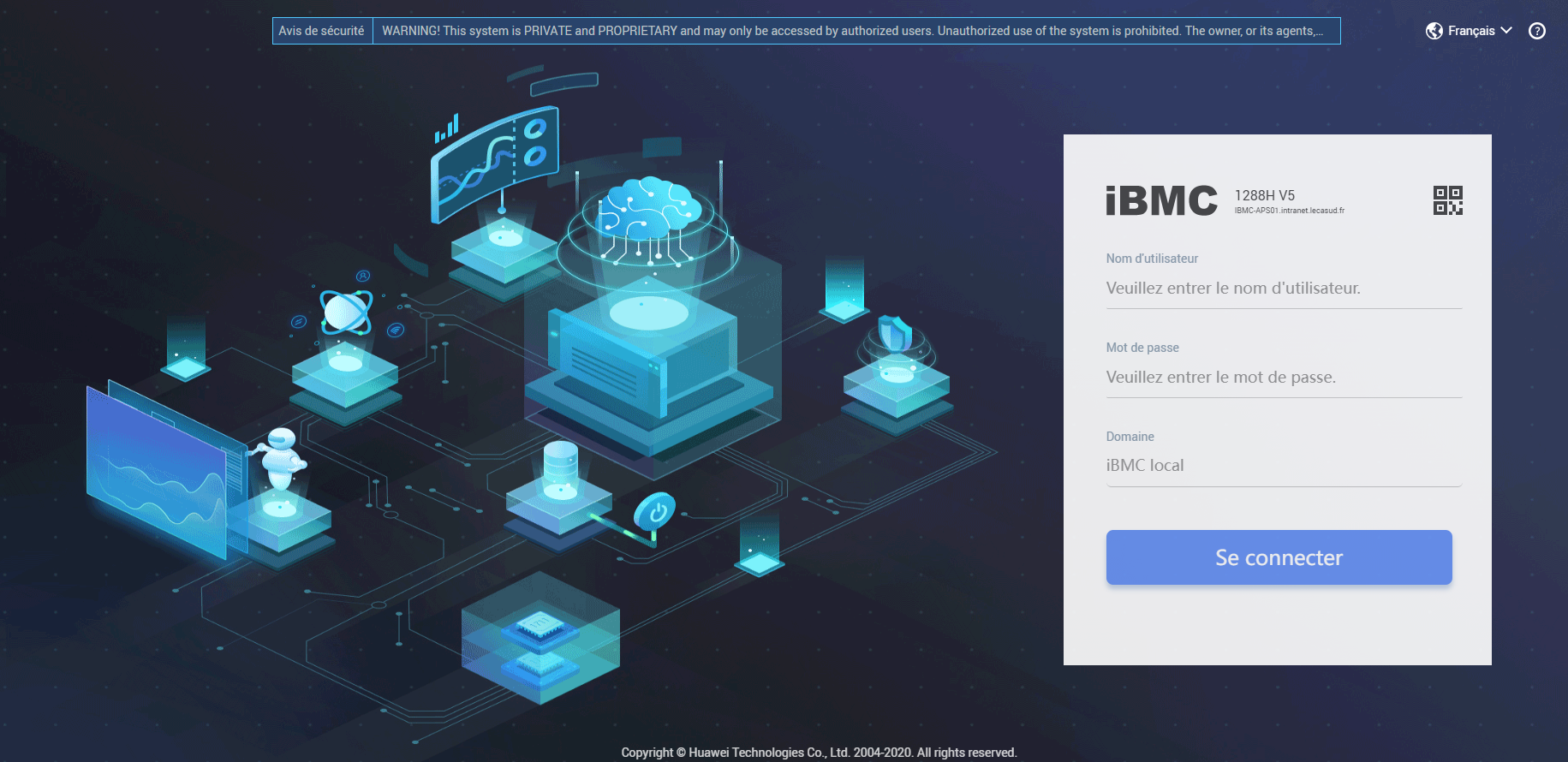 De retour au bureau, il faut rentrer l’ip de l’IBMC que nous avons paramétrer dans la barre d’adresse de notre navigateur : https://xxx.xxx.xxx.xxx. Nous arrivons sur la console web de l’IBMC