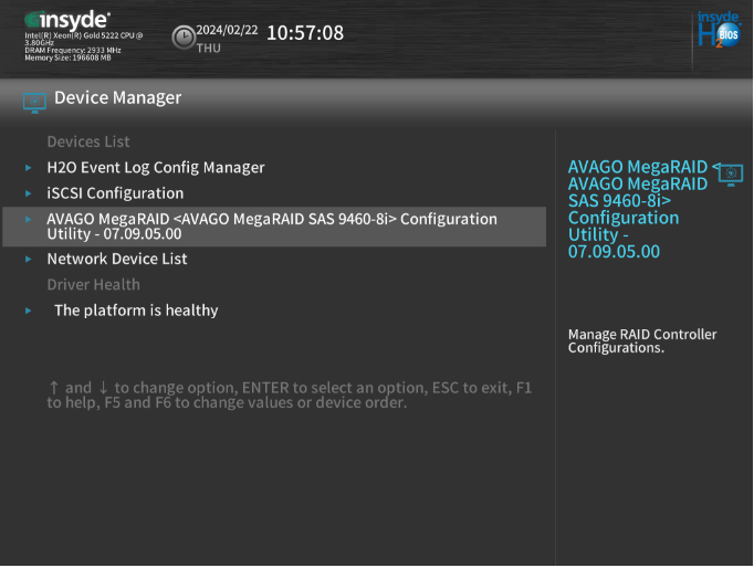 Dans « Device Manager », se rendre dans le menu nous permettant de configurer notre contrôleur RAID (le menu change de nom, selon le modèle du contrôleur »